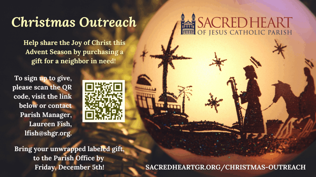 Help share the Joy of Christ this Advent Season by purchasing a gift for a neighbor in need!  Click here to sign up or contact Parish Manager Laureen Fish, lfish@shgr.org.  Please bring your unwrapped labeled gift to the Parish Office by Friday December 5th.