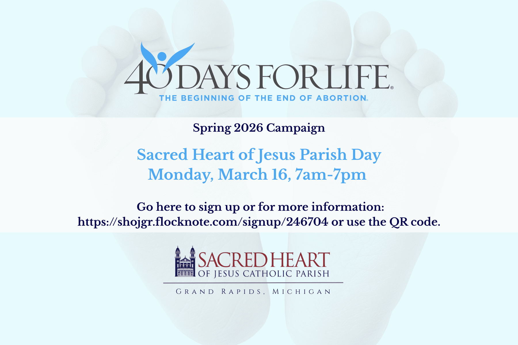 This campaign consists of 40 days of praying, fasting and holding a peaceful vigil in front of the abortion facility at Planned Parenthood at 425 Cherry St. This is a prayerful event, not a protest. Please commit to being a part of this spiritual battle. Sacred Heart of Jesus Parish has adopted Monday, March 16, 7am-7pm as our date. Go here to sign up or for more information: https://shojgr.flocknote.com/signup/246704 or use the QR code.