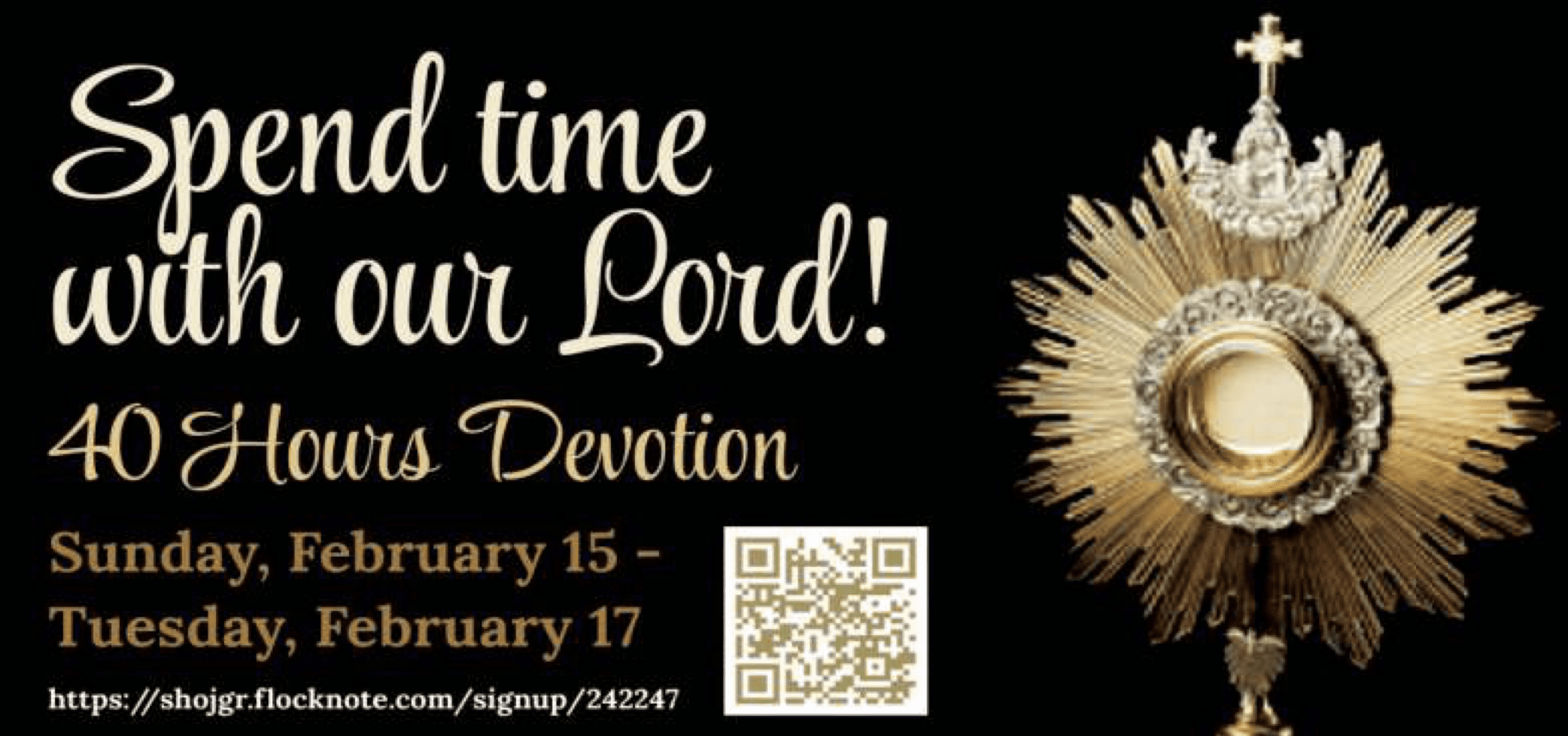 Our 40 Hours Devotion will begin at 1:00PM on Sunday, February 15 and end just before the 8:00AM Mass on Tuesday, February 17. This is a wonderful opportunity to spend time with our Lord solemnly exposed in the Blessed Sacrament and is a great way to prepare for Lent which begins on February 18. We will need 2 adorers for each 1-hour time slot.