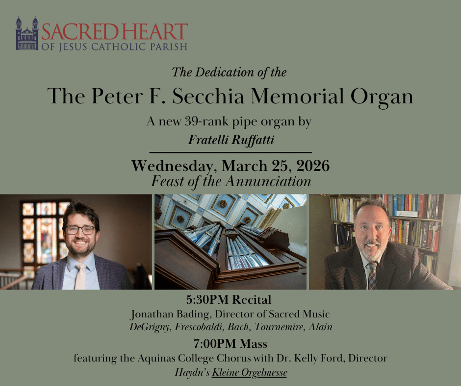 Sacred Heart’s Director of Sacred Music, Mr. Jonathan Bading, will give the dedication recital at 5:30pm, featuring the music of DeGrigny, Frescobaldi, Bach, Tournemire, and Alain. The Aquinas College Chorus, under the direction of Dr. Kelly Ford, will then sing the 7pm Mass, featuring Haydn’s Kleine Orgelmesse.